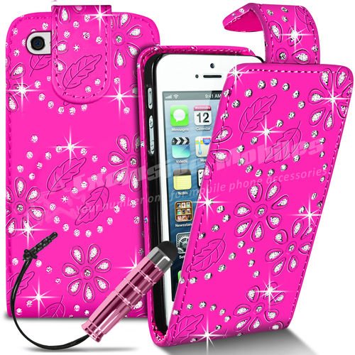 Full spec Hot Pink Girly iPhone 5-5s Bling 3D Flip Diamond Sparkle PU Leather Gemmed Case Cover for Women Girls Ladies | Diamante Gem Glitter Wallet Includes New Screen Protector & Free Stylus Pen | Apple iPhone 5-5s Cases Covers and Accessories by iChoose® - See Details :